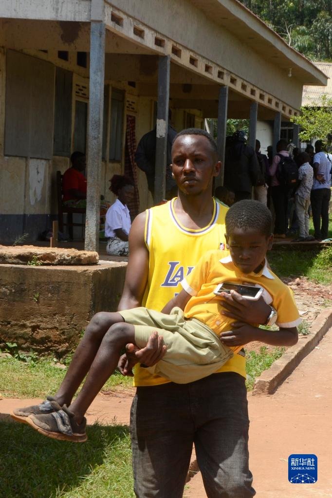 10月25日,在烏干達中部穆科諾地區一所盲人學校,一名男子抱著在火災中幸存的視障兒子。