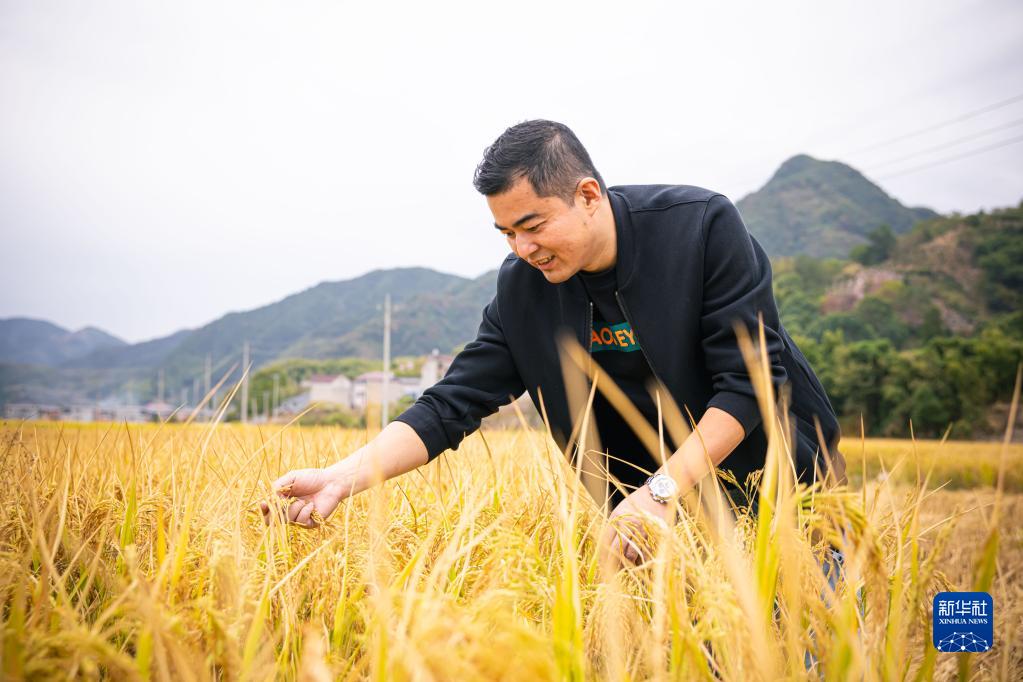 10月26日,建德市三都鎮新和村種糧大戶劉奕在稻田里查看成熟的稻穗。