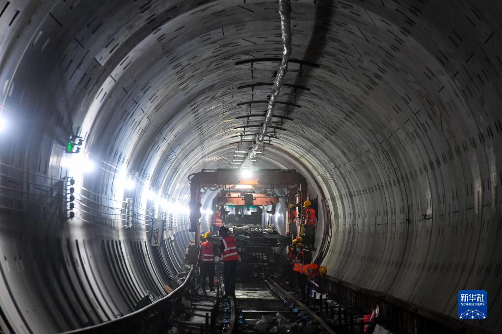 10月26日,施工人員在廣州地鐵11號線隧道內吊裝軌排。