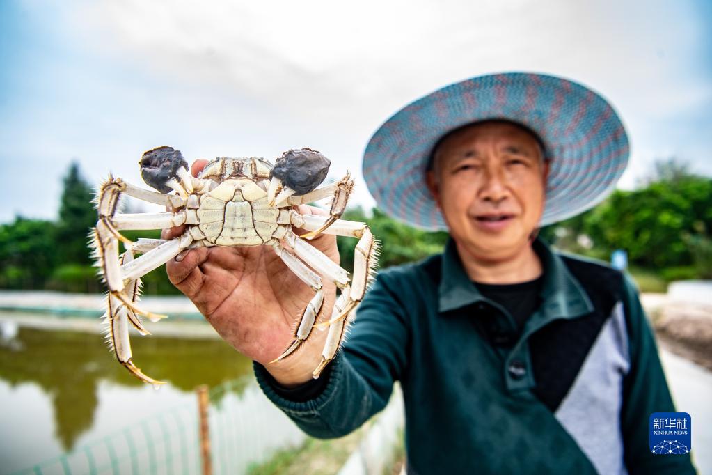在重慶市合川區龍市鎮缽耳村的稻蝦蟹養殖基地內,種養戶在展示稻蟹(2022年10月12日攝)。
