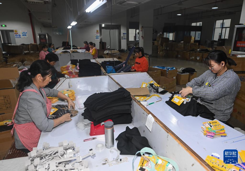 10月27日,在浙江省諸暨市大唐街道的一家企業(yè)車間內(nèi),工人在包裝保暖褲襪。
