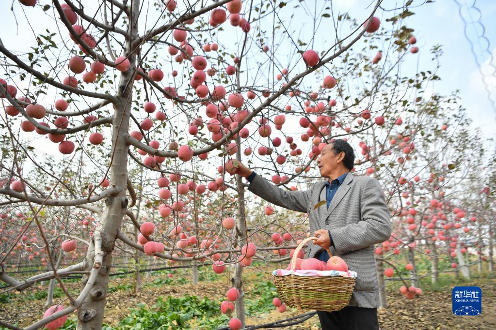 10月27日,在陜西省延安市安塞區南溝村,果農在果園采摘蘋果。 新華社記者 張博文 攝