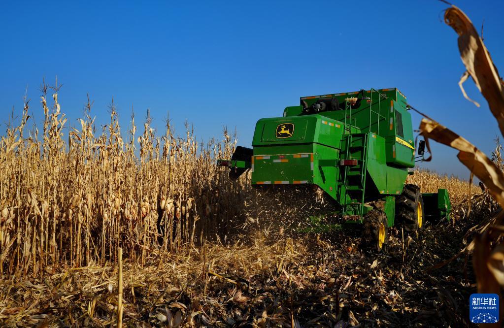 10月28日,在吉林省四平市梨樹縣國家百萬畝綠色食品原料(玉米)標準化生產基地核心示范區,農民駕駛農機進行秋收作業。