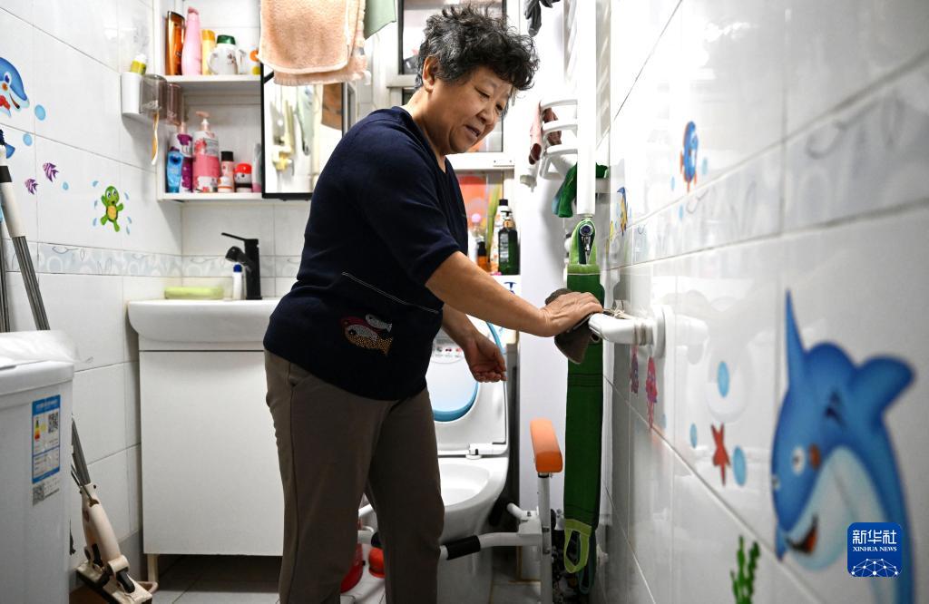 在天津市和平區文化村社區一居民家中,老人在擦拭衛生間內安裝的防滑助力扶手(10月27日攝)。