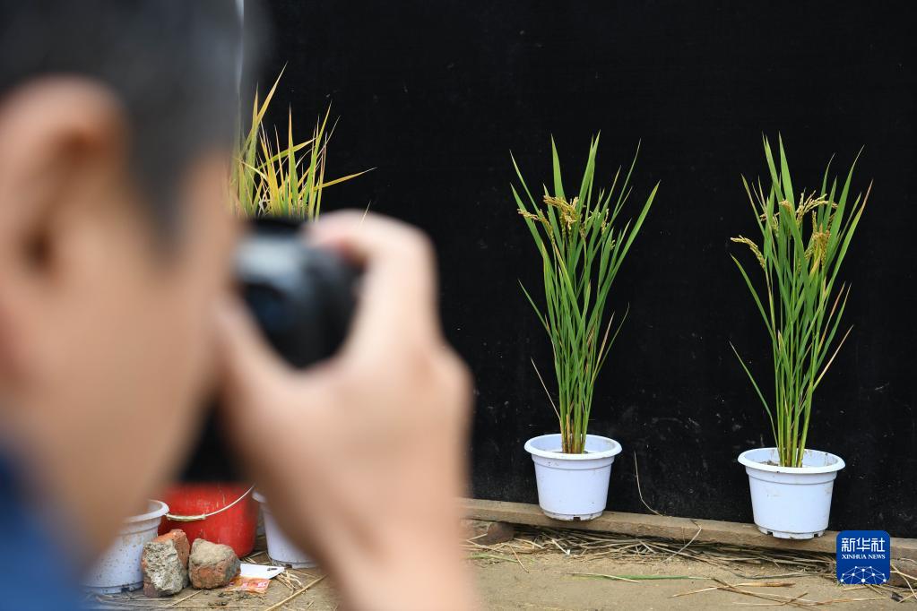 10月27日,在中科院合肥研究院智能所離子束生物工程與綠色農業研究中心的育種基地,副研究員葉亞峰給用于科研的水稻拍照。