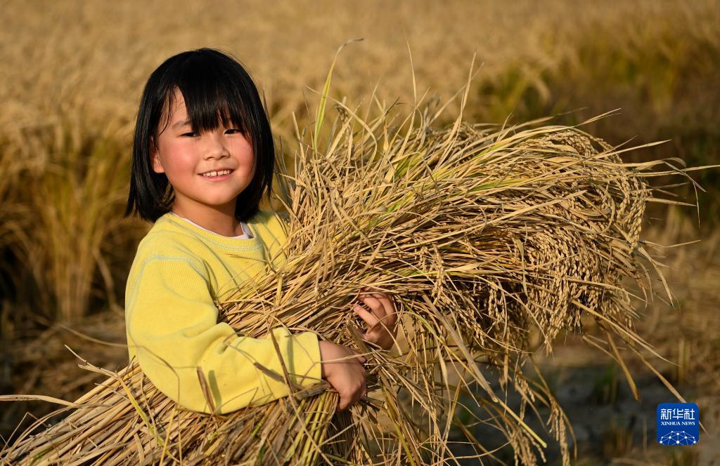 在陜西省西安市長安區王曲街道皇甫村,一名兒童在稻田里懷抱稻谷(2022年10月21日攝)。