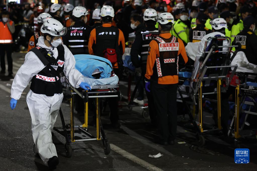 10月30日凌晨,在韓國首爾市龍山區梨泰院洞一帶,救護人員在現場工作。