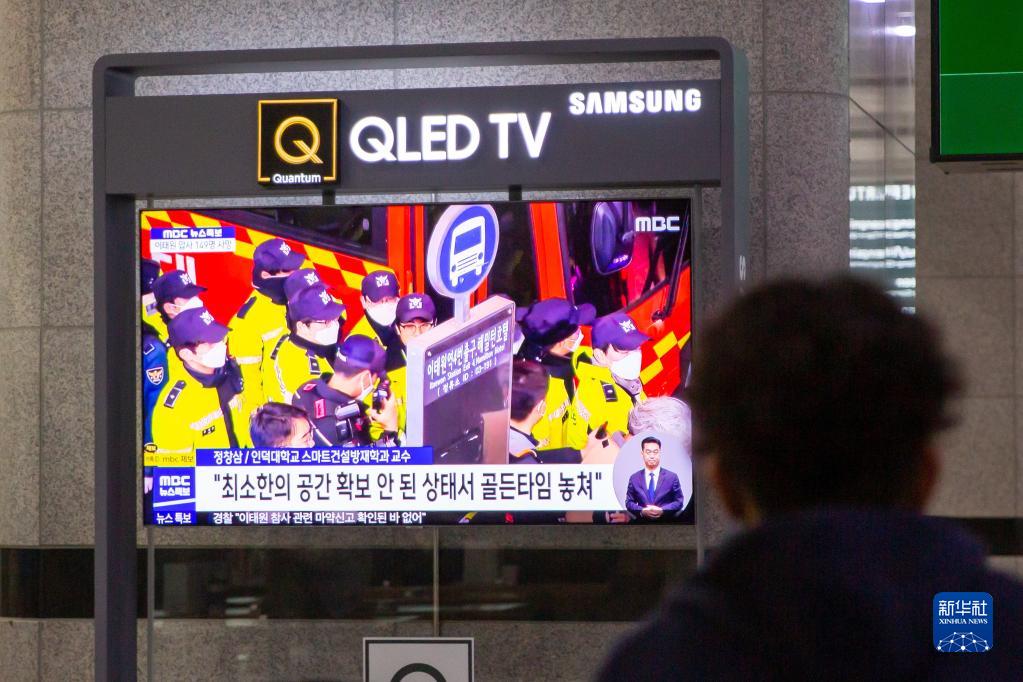10月30日,在韓國慶尚北道慶州,車站的電視播放踩踏事故相關(guān)報道。