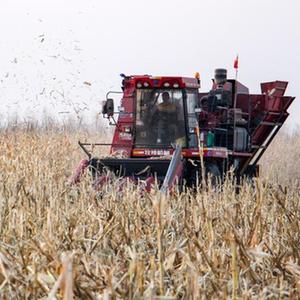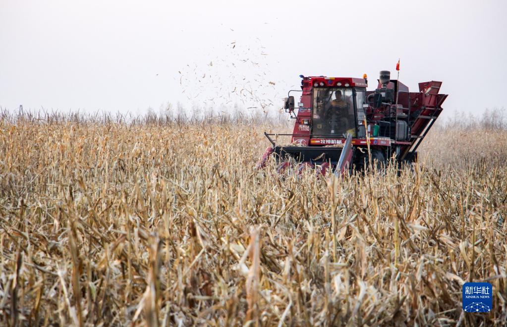 10月29日,在內蒙古通遼市科爾沁左翼中旗花吐古拉鎮三家子村的鹽堿化耕地改良試點示范區,農機手駕駛收割機收割玉米。