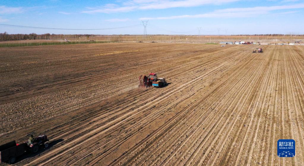 在內蒙古通遼市科爾沁左翼中旗花吐古拉鎮三家子村,農機手駕駛播種機在鹽堿化耕地改良試點示范區種玉米(2022年5月攝,無人機照片)。