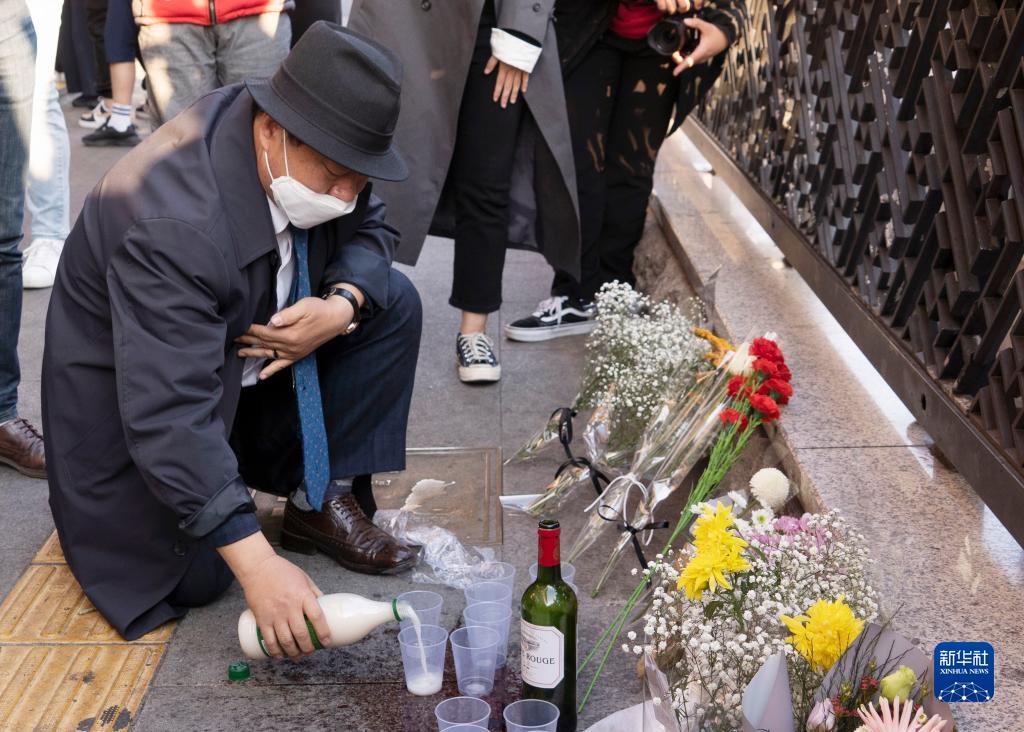 10月30日,民眾在韓國首爾市龍山區(qū)梨泰院洞一帶悼念踩踏事故遇難者。