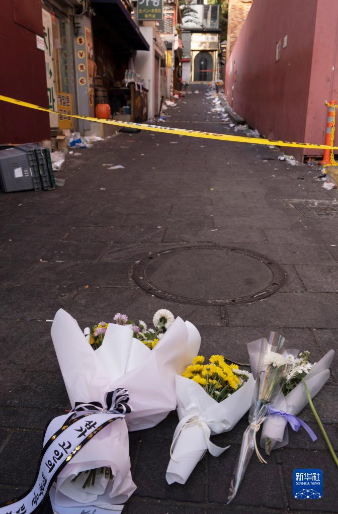 這是10月30日在韓國首爾踩踏事故現(xiàn)場拍攝的悼念鮮花。