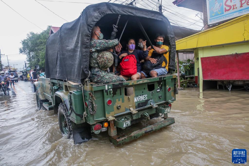 10月30日,人們搭乘軍用車輛在菲律賓甲米地省涉水前行。