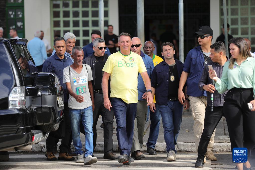 10月30日,巴西右翼陣營自由黨候選人、現任總統博索納羅(中)在里約熱內盧參加投票后離開投票站。