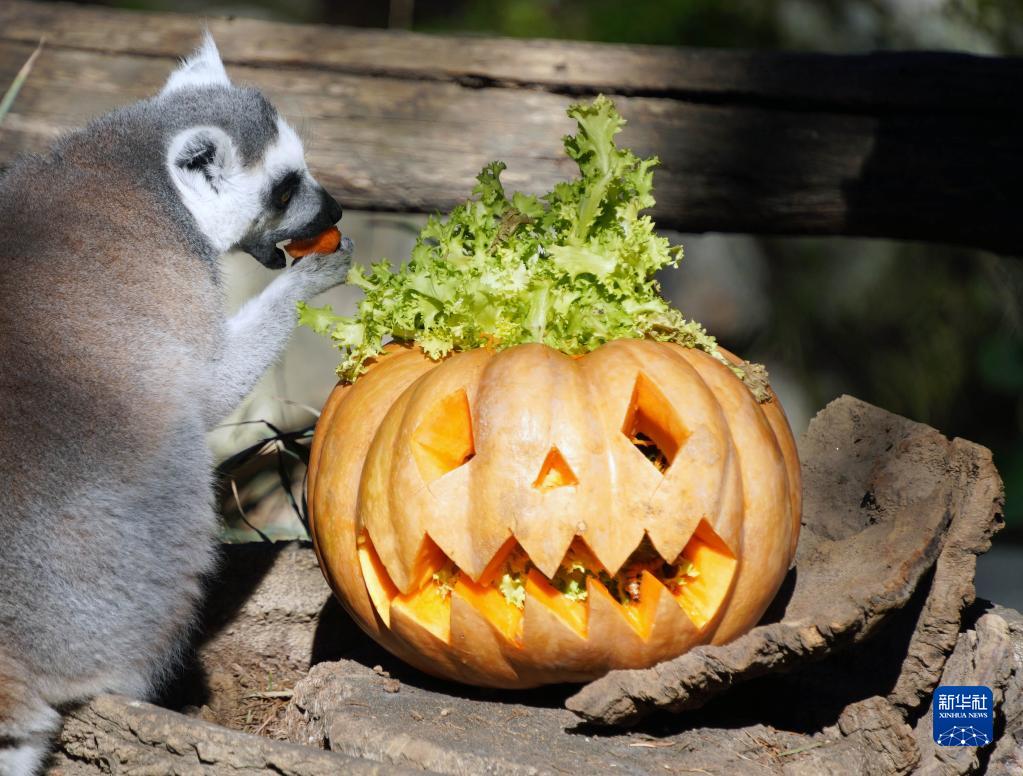 10月30日,在意大利羅馬動物園,環尾狐猴享用節日南瓜。