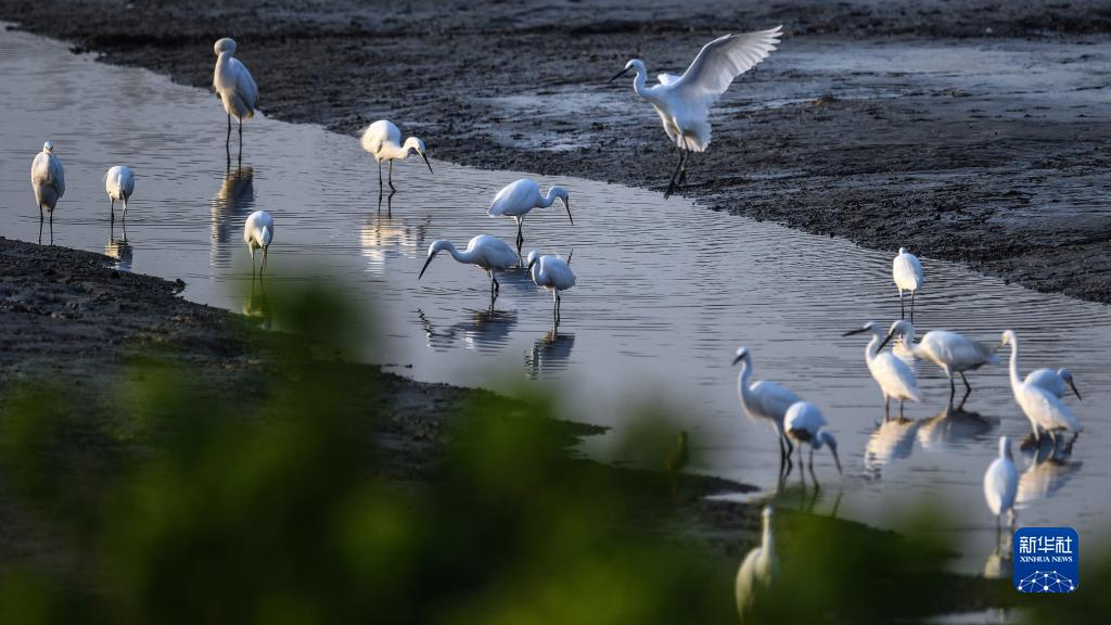 鳥兒在廣西山口紅樹林生態(tài)國家級自然保護區(qū)淺水處覓食(10月23日攝) 。