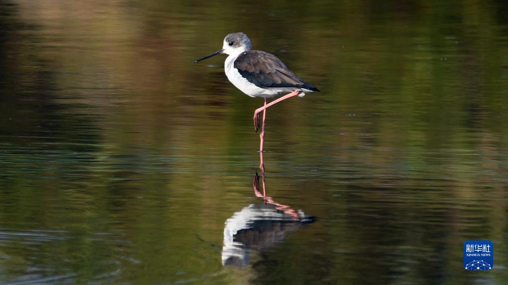一只鳥在廣西山口紅樹林生態(tài)國家級自然保護區(qū)的水中停留(10月23日攝)。