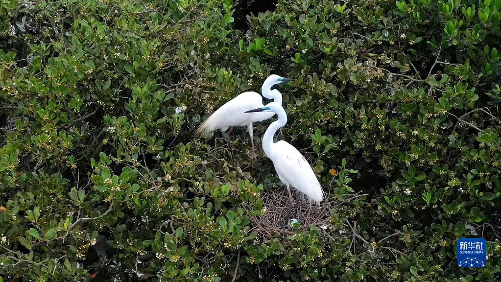 在廣西山口紅樹林生態國家級自然保護區,兩只鳥在紅樹林中棲息(8月25日攝,無人機照片)。