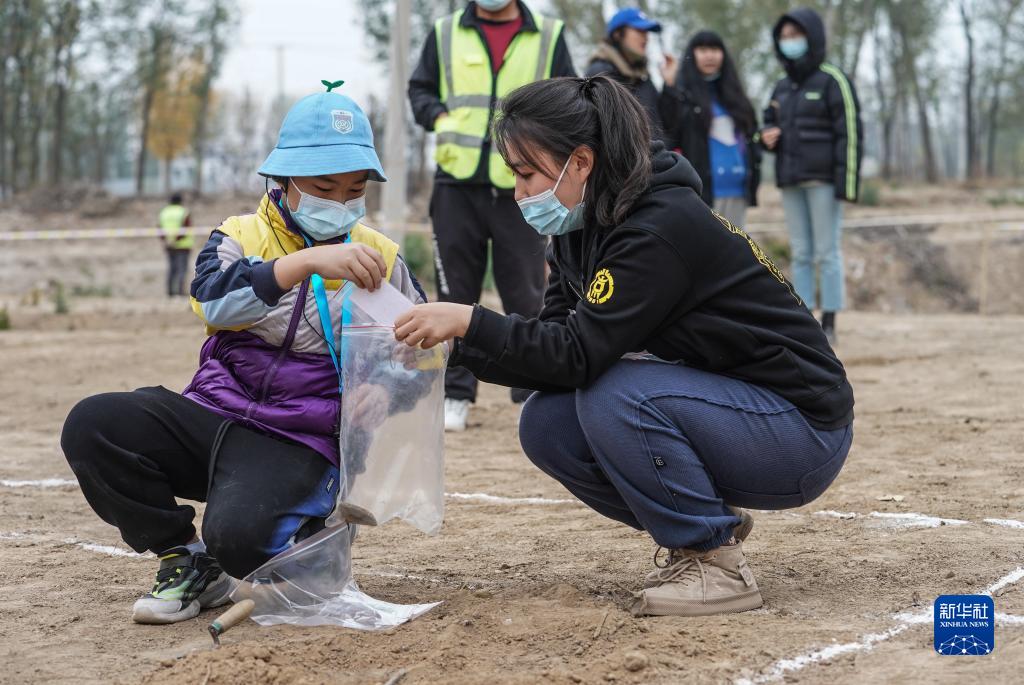 10月30日,考古隊工作人員(右)協助小朋友把“發掘”出的陶片和填寫好的標簽裝袋。