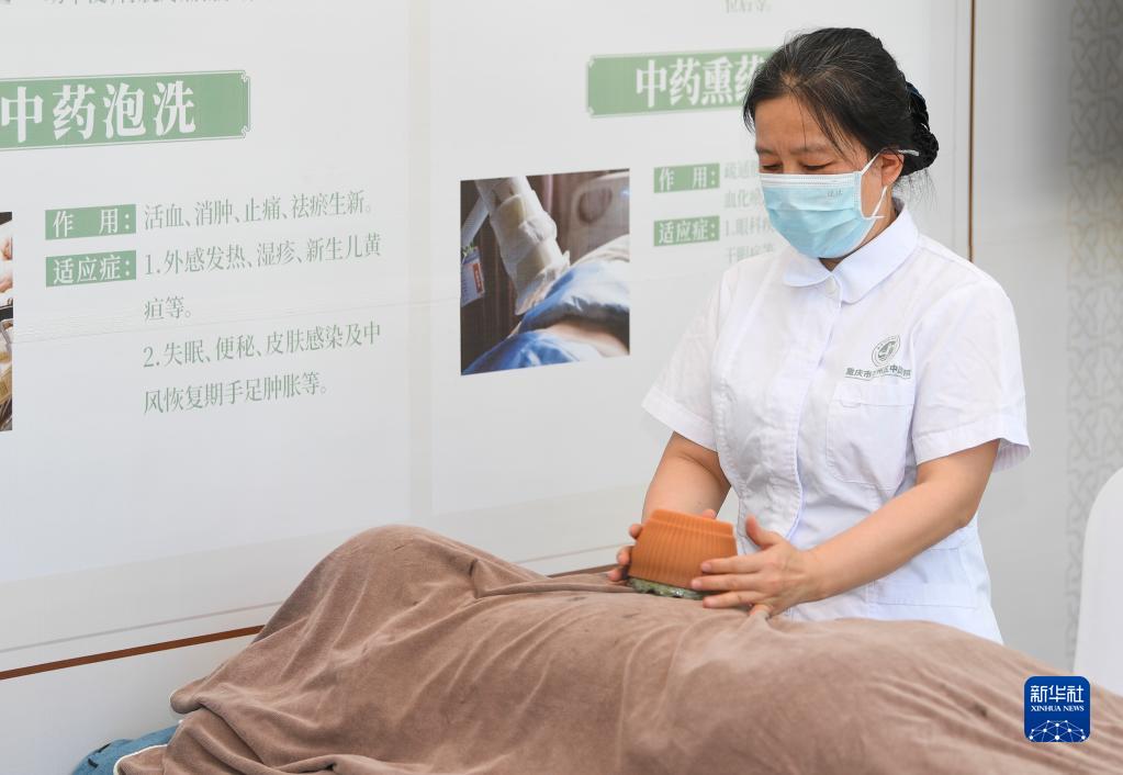 10月31日,工作人員在博覽會上為參觀者提供中醫特色療法體驗。