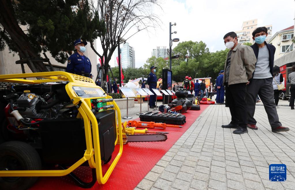 10月31日,市民在一組消防救援設備展示攤位前駐足觀看。