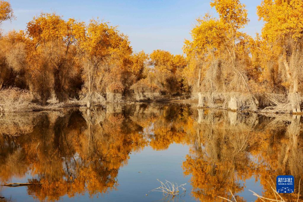 深秋時節,新疆塔里木河流域胡楊林披上“金裝”,與碧水、大漠相互映襯,構成一幅秀美的生態畫卷。新疆沿塔里木河流域分布著約1500萬畝胡楊林,是世界面積最大的胡楊林區。