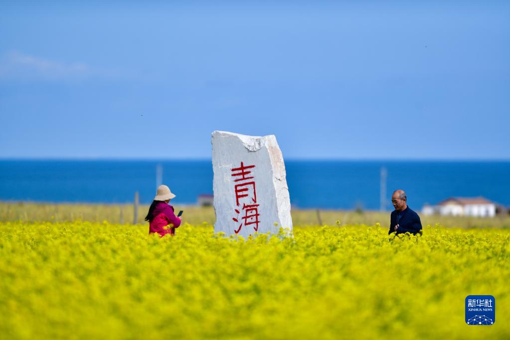 游客在青海湖畔的油菜花田里游玩(2019年9月14日攝)。