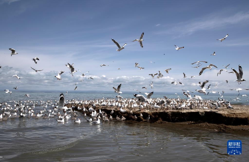 一群水鳥在青海湖鳥島濕地活動(2021年7月1日攝)。
