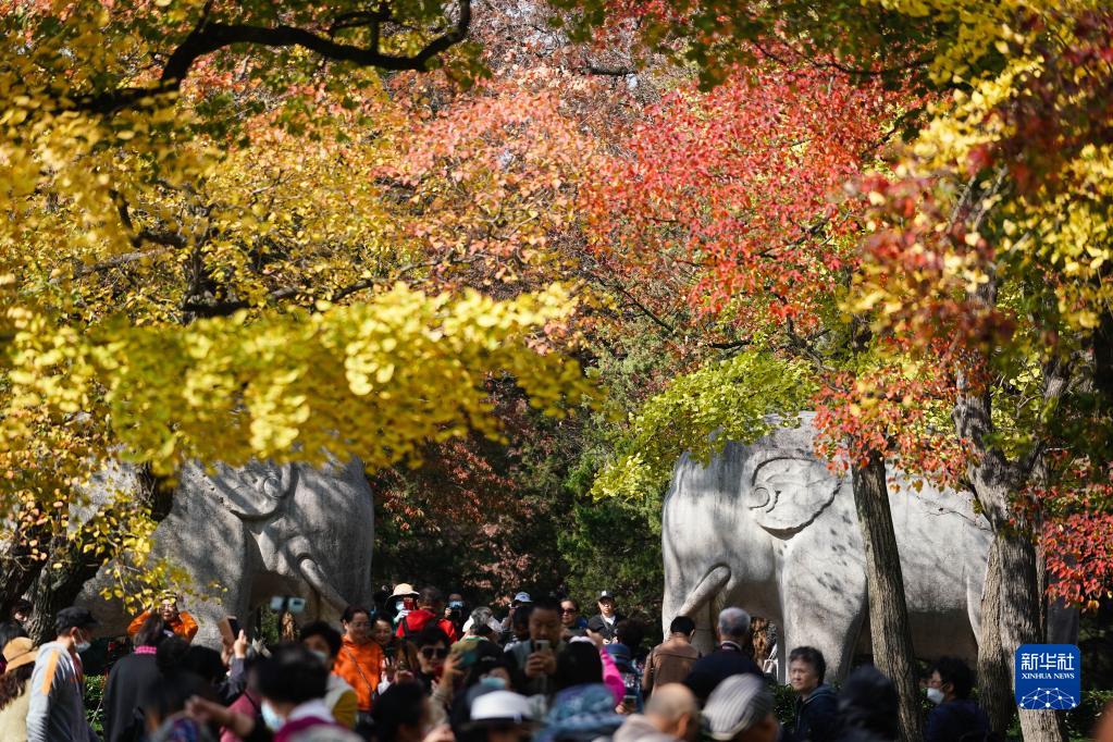 11月1日,游人在南京明孝陵石象路欣賞美景。