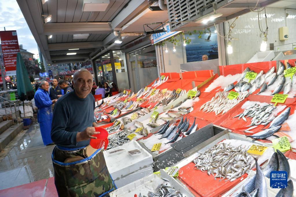 11月3日,在土耳其安卡拉,一名商販在攤位賣魚。