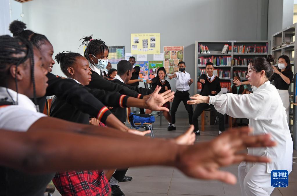 11月3日,在納米比亞首都溫得和克的毛澤東主席中學,學生在中國援納醫療隊醫生的帶領下學習八段錦。