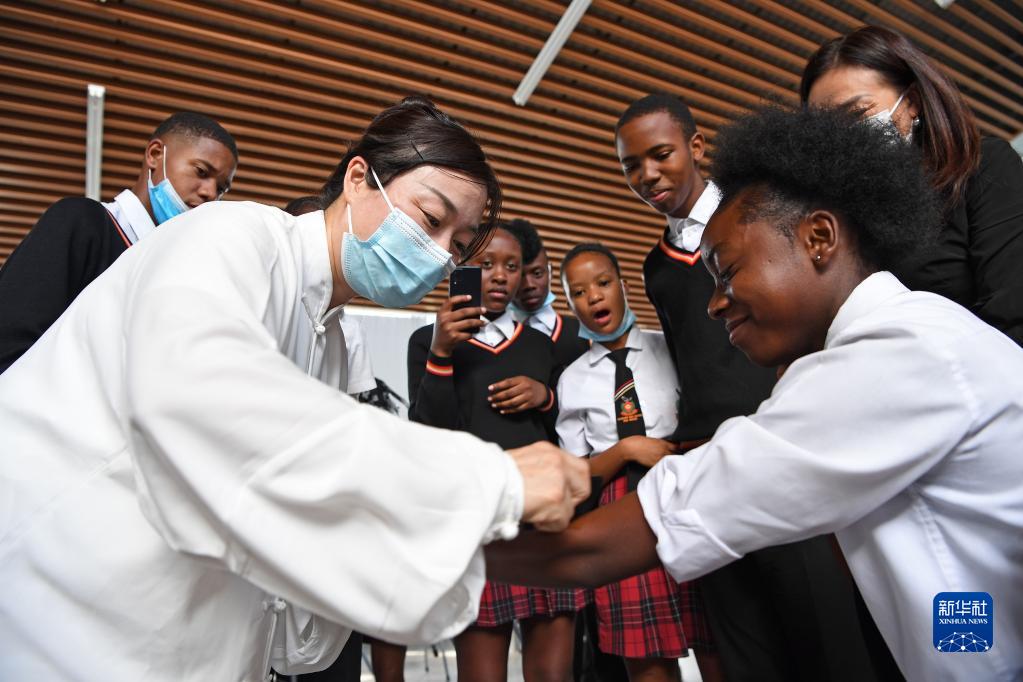 在納米比亞首都溫得和克的毛澤東主席中學3日的中文課上,第十四批中國援納醫療隊用銀針、火罐作教具,以推拿、做操為內容,讓同學們在輕松愉悅的學習中體驗中國傳統醫學文化。