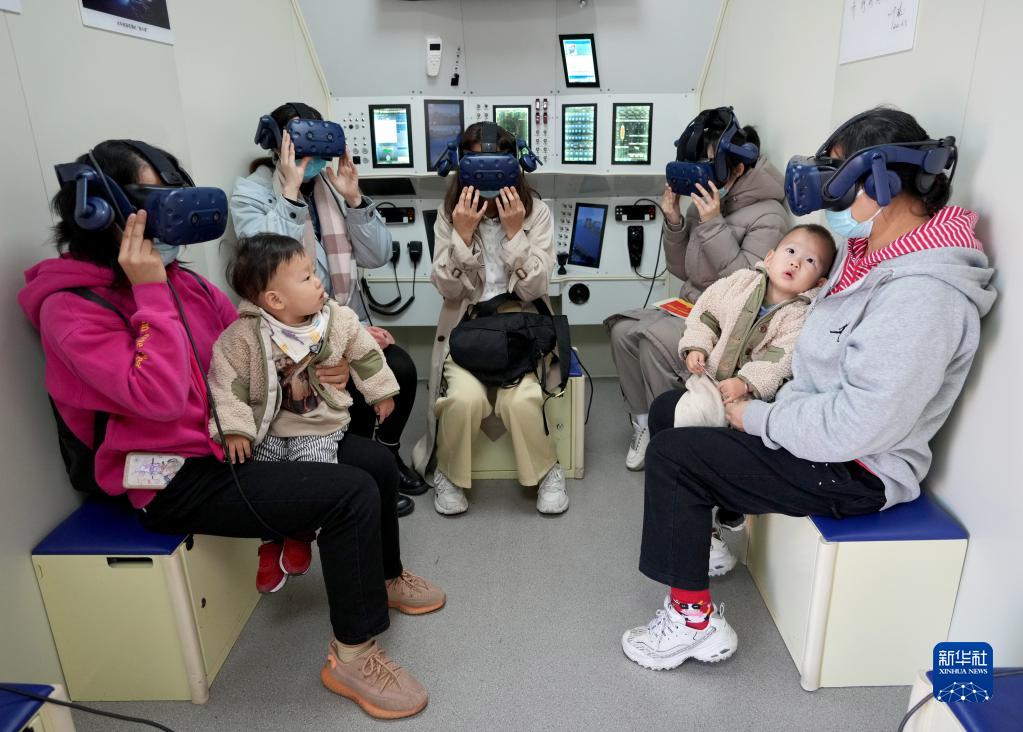 11月4日,王麗鶴(左一)與姐姐(右一)分別抱著王麗鶴雙胞胎兒子在“奮斗者”號深載人潛水器模型內通過VR觀看海底世界。