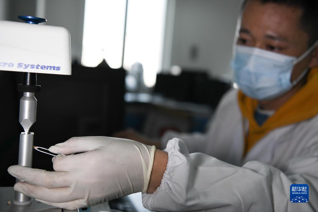 11月3日,在安徽省農(nóng)業(yè)科學院園藝研究所實驗室內,石榴創(chuàng)新團隊成員賈波濤通過儀器測量石榴籽的硬度。