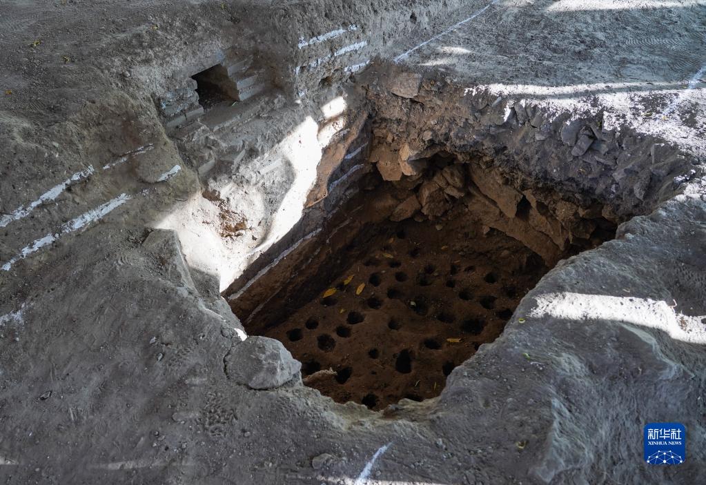 11月4日拍攝的“田字房”建筑臺基基槽底部密集的地釘孔和其上方的排水暗溝。