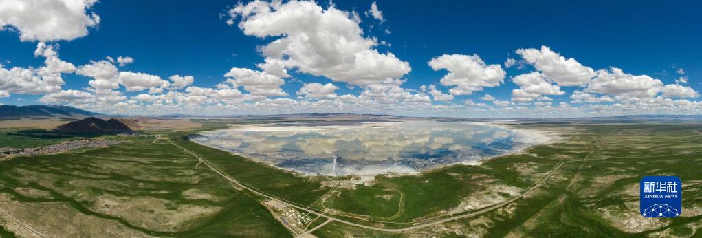 新疆巴里坤湖及湖畔濕地夏季風光(2021年7月1日攝,無人機全景照片)。