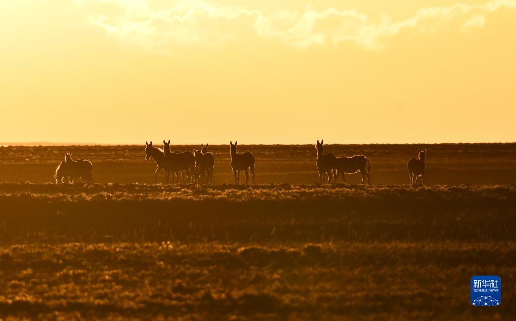 藏野驢在新疆阿爾金山國家級自然保護區內的依協克帕提濕地覓食(2022年8月3日攝)。