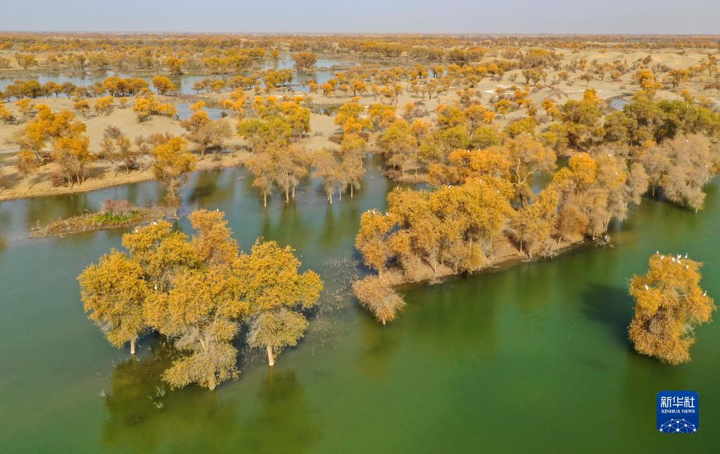 新疆尉犁縣羅布淖爾國家濕地公園秋景(2022年10月31日攝,無人機照片)。
