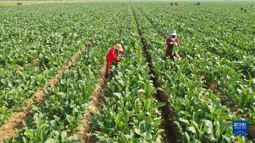 11月5日,在河南省許昌市建安區榆林鄉的蔬菜基地,菜農在采收蔬菜(無人機照片)。