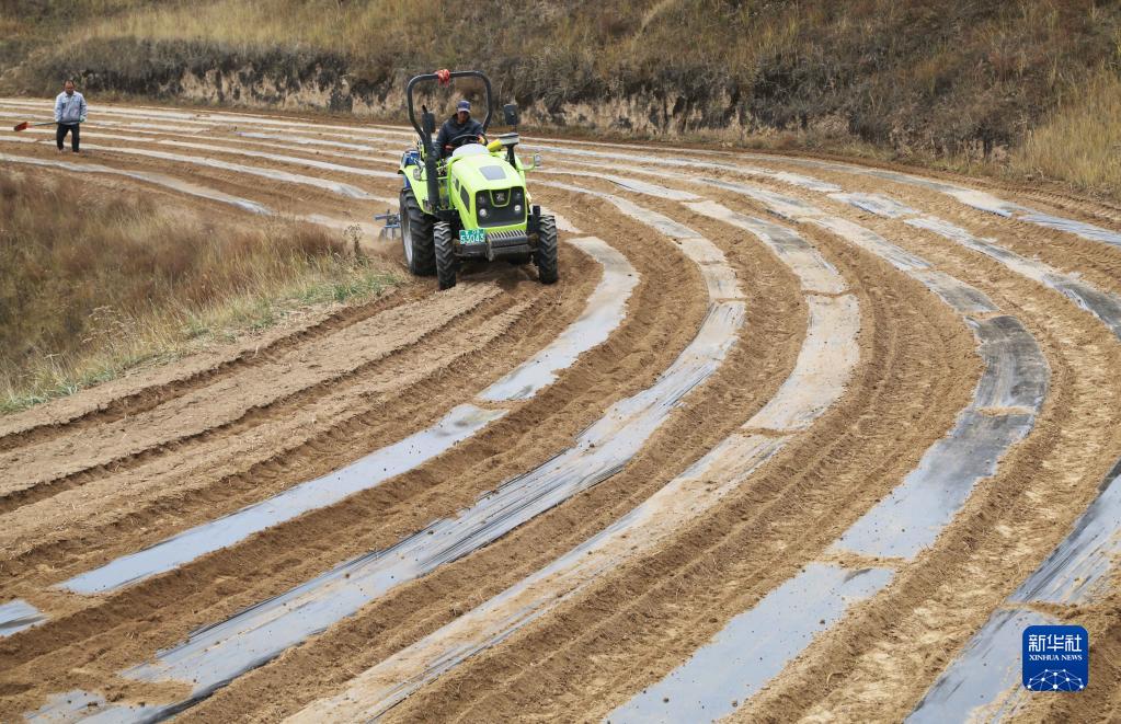 11月5日,農機手駕駛農機在甘肅省定西市安定區葛家岔鎮黃家灣村覆地膜保墑。