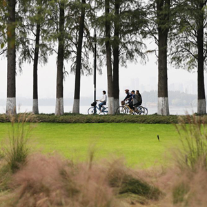 11月5日,市民在武漢東湖綠道騎行。