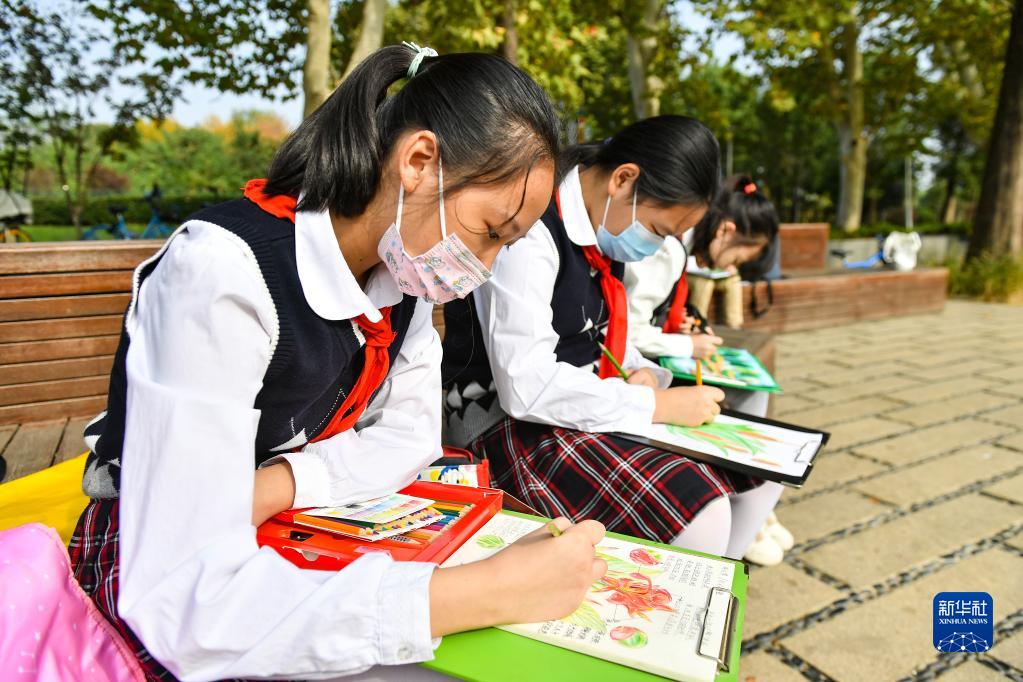 11月5日,學生在武漢華僑城生態(tài)濕地公園內畫植物。