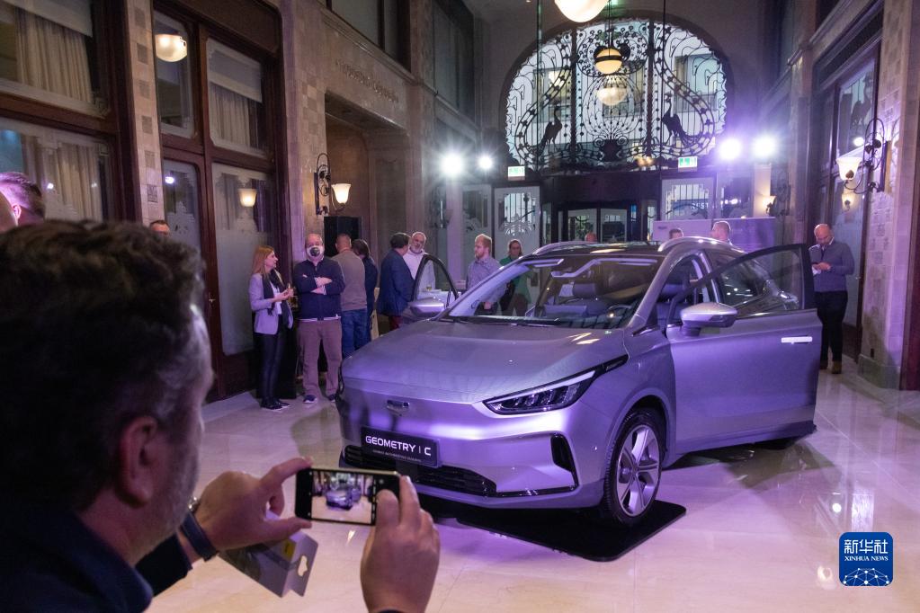11月4日,在匈牙利布達佩斯,一位參觀者拍攝展出的吉利幾何C型電動汽車。