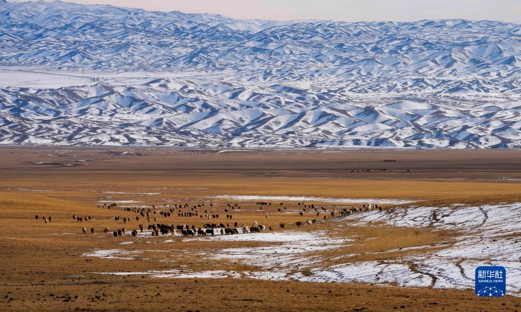 羊群在新疆裕民縣巴爾魯克山冬季牧場上覓食(11月4日攝)。