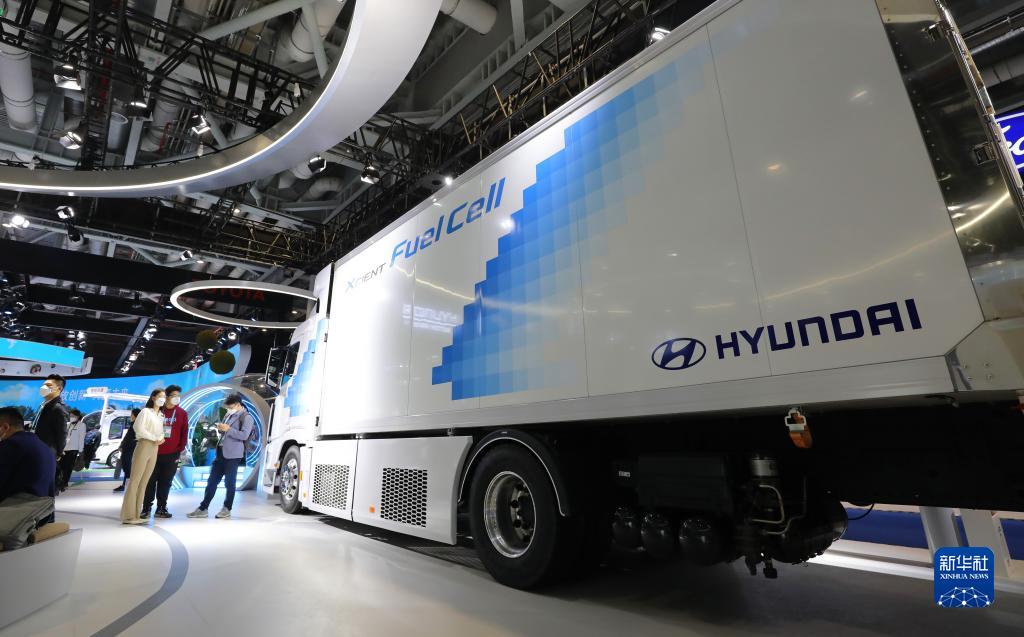 11月6日,參觀者在第五屆進博會汽車展區韓國現代汽車公司展臺的氫燃料電池重卡旁交流。