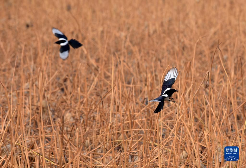 11月5日,喜鵲在安徽巢湖半島國(guó)家濕地公園內(nèi)飛翔。