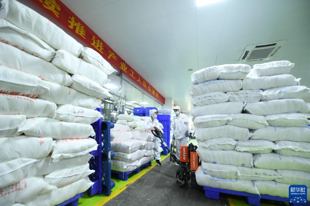 11月7日,在柳州螺螄粉生產集聚區廣西善元食品有限公司生產車間,工人在搬運材料。