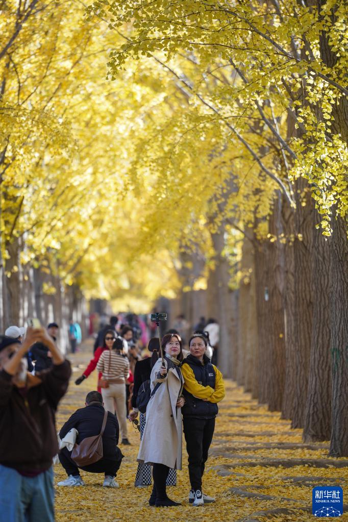 11月7日,游人在北京釣魚臺國賓館旁的銀杏大道上拍照留念。