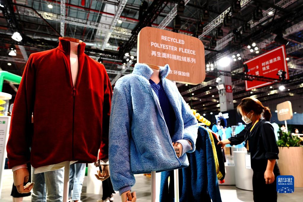 11月7日,優(yōu)衣庫參展人員在第五屆進(jìn)博會(huì)上介紹參展的環(huán)保服裝,該服裝面料采用源自回收塑料瓶的再生聚酯纖維。