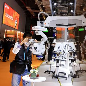 11月6日,參觀者在第五屆進(jìn)博會蔡司展臺體驗眼科導(dǎo)航手術(shù)顯微鏡。